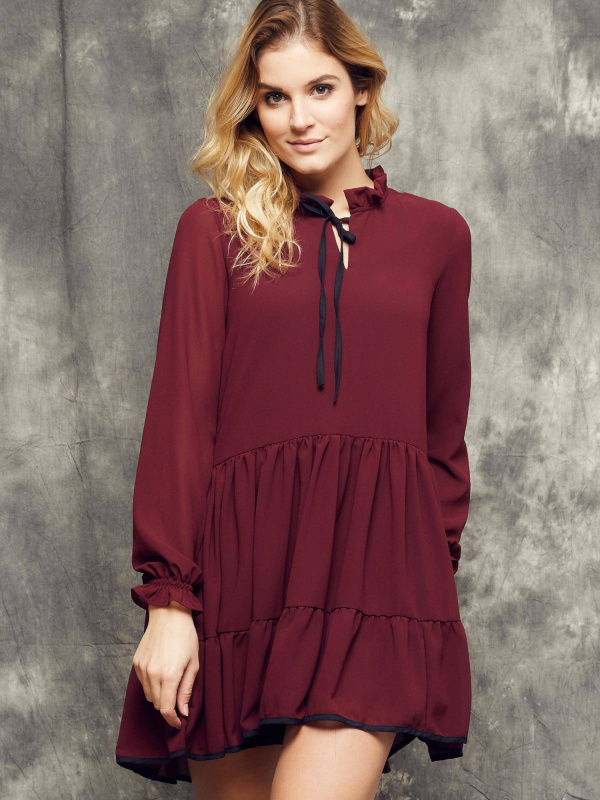 Cocomore Boutiqe dress with stand-up collar and ruffles burgundy